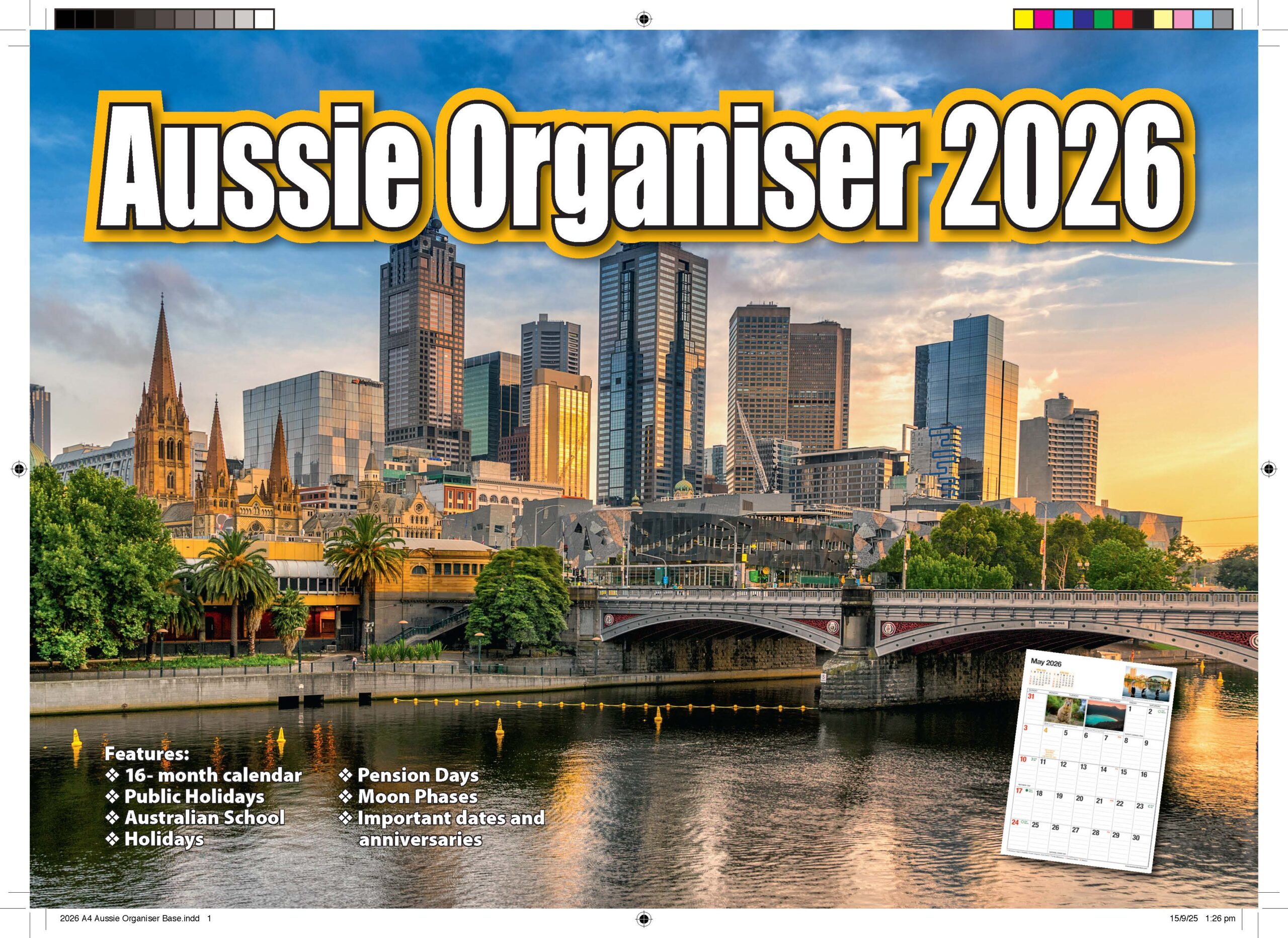 Our well-known Aussie Organiser sells out fast every year; our comprehensive Australian date pad Pension Days, Public Holidays, State holidays, School holidays and an additional four months for future planning. Everything you need for the busy lifestyle, and with ample room for writing, it is the best family planner around. Smaller pictures appear monthly, so you have some exciting places to look at. When hanging open this calendar 297mm wide and 420mm long-a double page date pad calendar, when open It fits nicely on the pantry door. Our comprehensive Australian Date Pad includes Pension Days, Public Holidays, State holidays, School holidays and an additional four months for future planning.