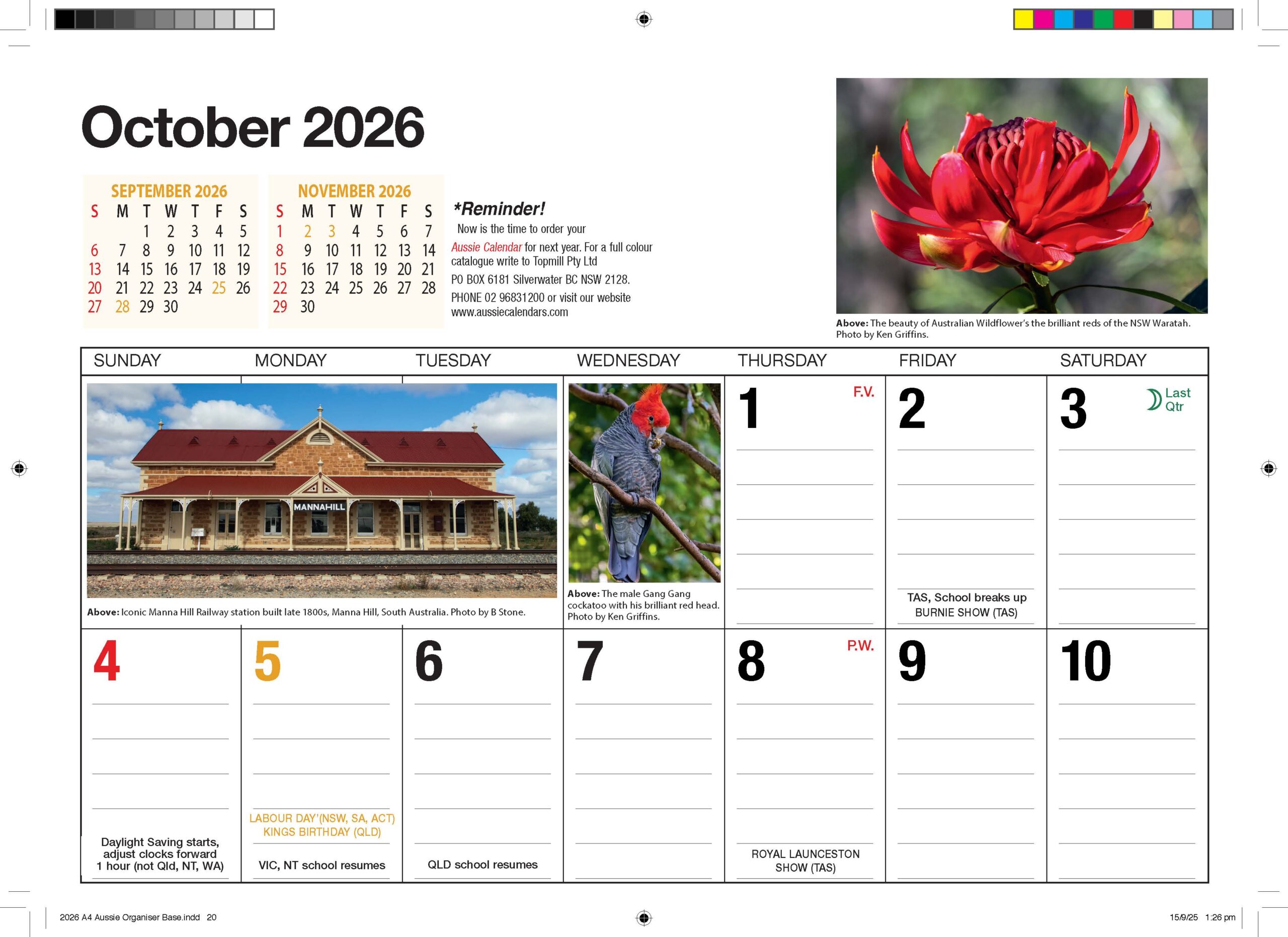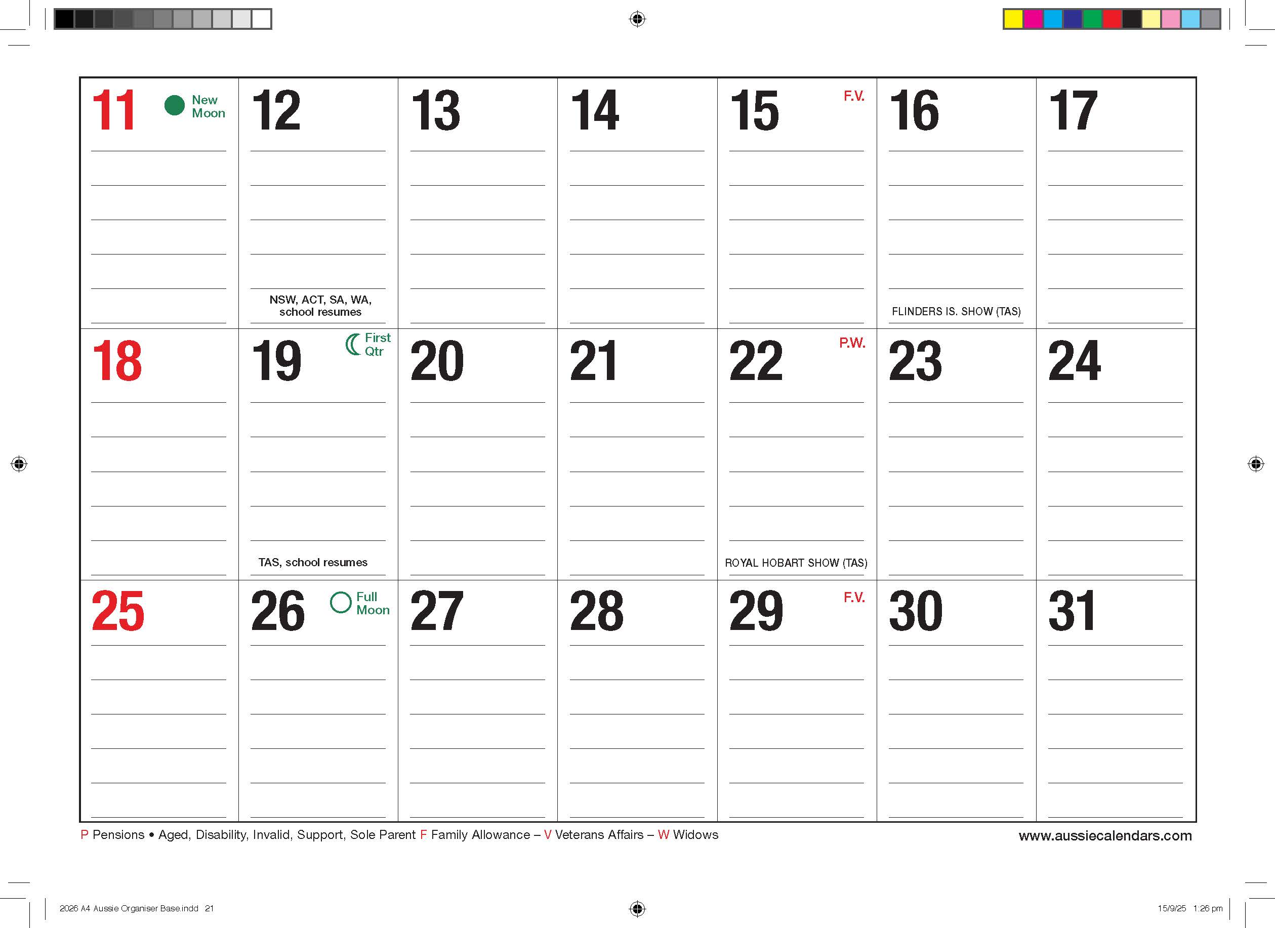 PRINTED IN AUSTRALIA OPEN SIZE: 297 X 420MM- Double Page Date pad Closed SIZE: 297 x 210mm